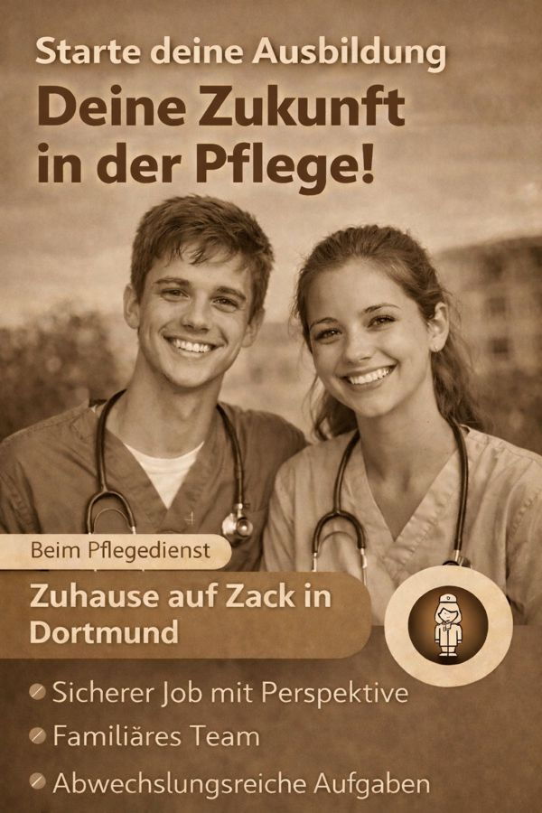 Du suchst eine Ausbildung in Dortmund, die Sinn, Sicherheit und echte Zukunftsperspektiven bietet? Dann starte deine 3-jährige Ausbildung zur examinierten Pflegefachkraft beim ambulanten Pflegedienst Zuhause auf Zack. In einem Beruf mit Verantwortung und gesellschaftlicher Bedeutung lernst du, Menschen professionell zu unterstützen und ihnen ein selbstbestimmtes Leben in ihrer vertrauten Umgebung zu ermöglichen.